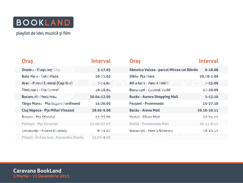 Pe parcursul Caravanei BookLand prin ţară, am avut ocazia de a cunoaşte oameni minunaţi, dornici să ne ajute în demersul nostru cultural de mediatizare şi promovare a cărţii. Poeţi, prozatori, critici literari, pictori, preşedinţi de filiale ale Uniunii Scriitorilor sau Artiştilor Plastici din România. As enumera cativa din Moldova, atat de dragi mie: Carmen Veronica Steiciuc, un extraordinar organizator de evenimente culturale si festivaluri literare, Gheorghe Neagu de la Oglinda literara din Focsani, Lucian Manailescu de la Buzau, Constantin Marafet din Rm. Sarat, organizatorul Festivalului de creatie literara Titel Constantinescu, d-na profesor universitar Mihaela Garlea din Iasi, dar si promoteri culturali din Ardeal, dl. Dorel Cosma, directorul Centrului Cultural G. Cosbuc din Bistrita Nasaud si multi altii. Sper sa nu supar pe nimeni daca nu i-am enumerat pe toti. Sunt convins ca si in 2013 vom gasi aceeasi deschidere si receptivitate, din partea comunitatilor culturale locale, din partea oamenilor de cultura, de a organiza evenimente artistice si culturale in fiecare locatie, unde va poposi Caravana BookLand.