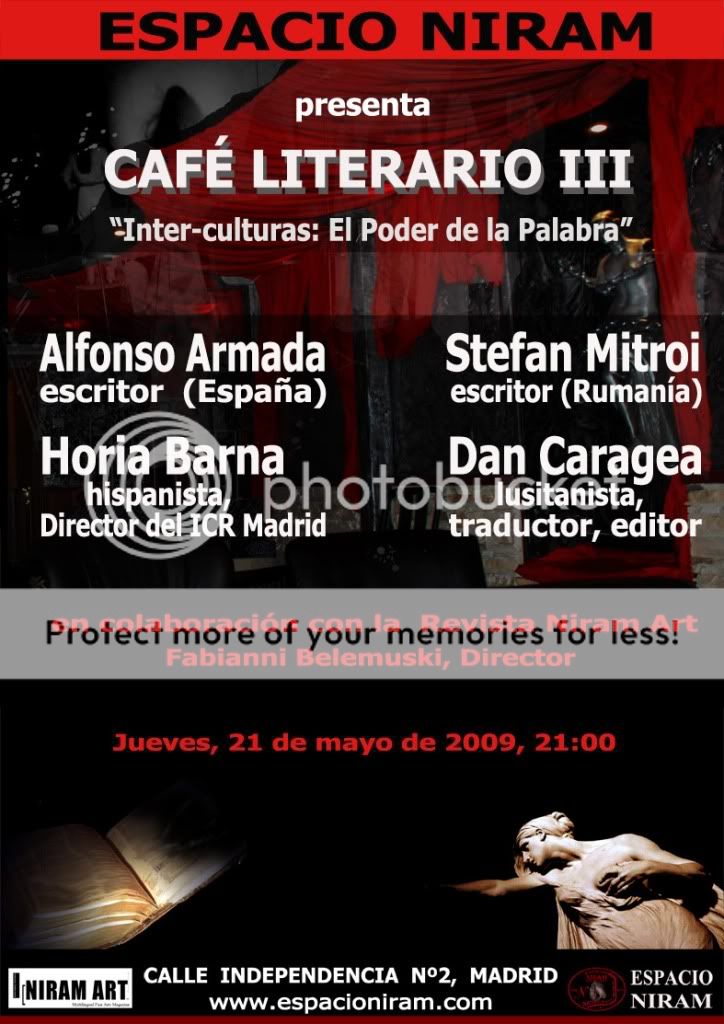 Espacio Niram – Madrid, in colaborare cu Revista Niram Art, organizeaza cea de a treia intalnire din cadrul Cafenelei Literare, intitulata “Inter-cultura: Puterea cuvantului”, Joi, 21 mai 2009, la orele 21. Dialogul literar hispano-roman va fi moderat de Fabianni Belemuski, directorul Revistei Niram Art.